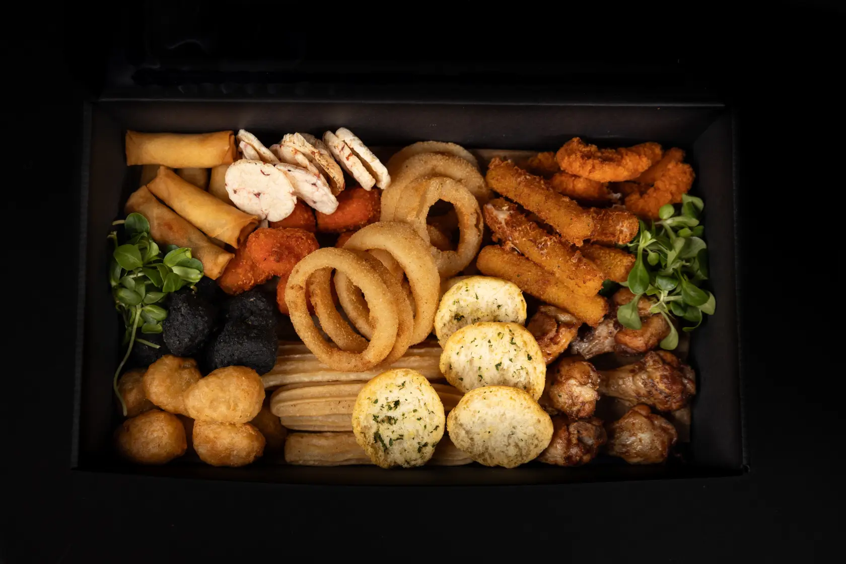 Nuggets kepsneliai, čederio kepsneliai, daržovių suktinukai, svogūnų žiedai, mini picos, vištienos sparneliai, mozarella lazdeles, aštrios surio spurgytės (skirtas 8-10 žmonių)
