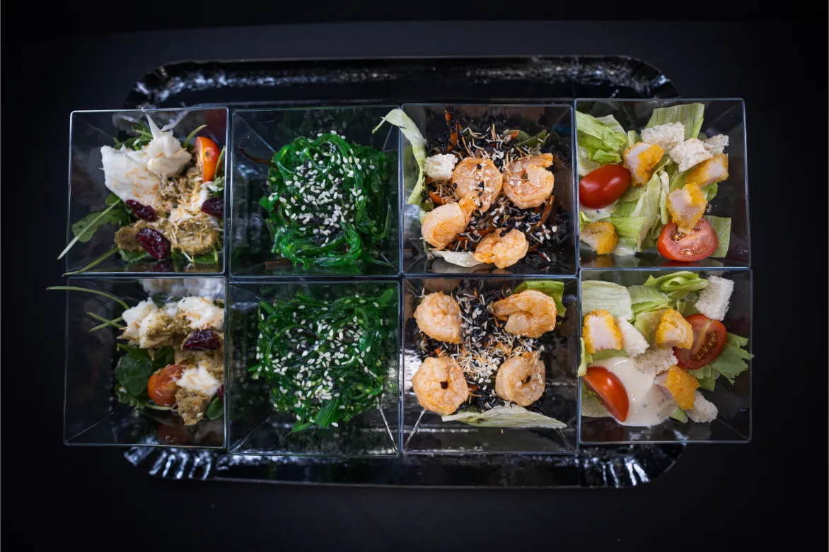 Cezario salotos, wakame salotos su agurkais, juodų juros dumbliu salotos su krevėte, mocarella sūrio su pomidorų ir pesto salotos.